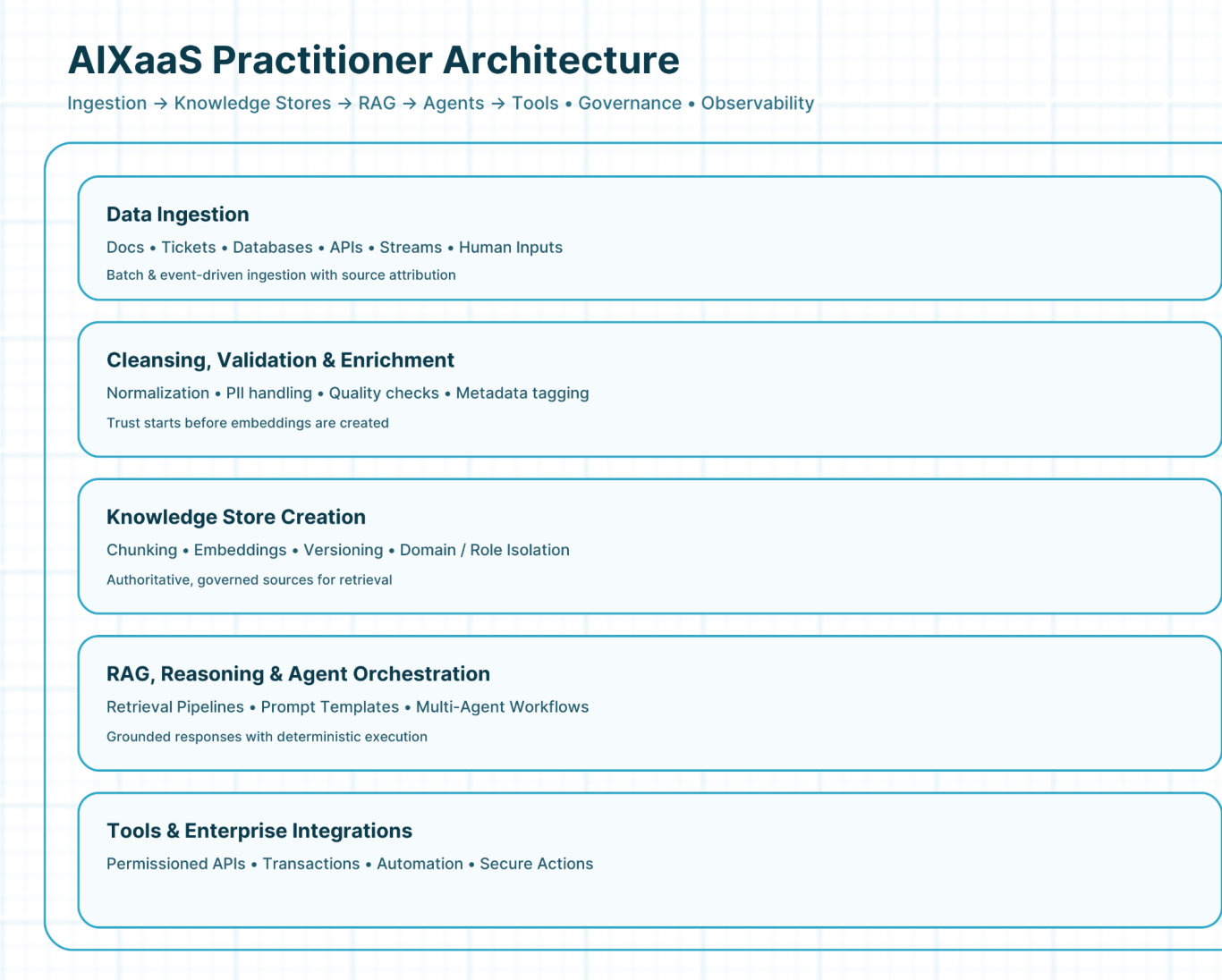 This architecture illustrates how AIXaaS turns raw enterprise data into production-grade, trusted AI systems by design, starting with governed data ingestion and knowledge store creation, flowing through controlled RAG and agent orchestration, and ending with secure tool execution.